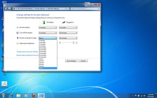 PONER equipo a dormir nunca en opción de batería Seleccione (ver figura) y guardar la configuración
