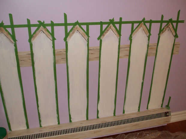 El siguiente paso fue pintar el tablero horizontal que corre detrás de los listones verticales. He marcado donde iría a lo largo de la longitud de la cinta horizontal y luego llena el espacio donde sería visible la junta horizontal.