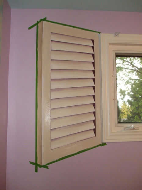 2.) la cinta hacia fuera de los listones de la persiana. Ya que el obturador está en un ángulo el espacio entre los listones será más estrecho más cerca a la ventana. Cinta el paralelo superior a la parte superior de la persiana y el paralelo de la parte inferior a la parte inferior de la persiana. Sé que esto no es la verdadera perspectiva pero... lo suficientemente cerca para los críos. Dividir el lado izquierdo por 12, entonces el lado derecho por 12 - Esto hará que los obturadores aparecen en perspectiva. La cinta horizontal define los bordes inferiores de las láminas (excepto la parte superior, que es la parte superior del listón superior)