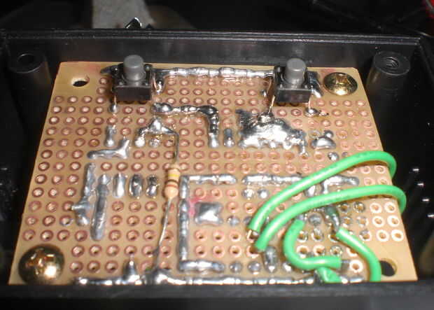 Se tiene que montar los posición ajuste los interruptores S1 y S2 al lado cobre de la Junta de proto. Una vez que éstos se sueldan en la placa, necesitará marcar y taladrar dos agujeros en el proyecto de la cara del metal de la caja para los botones de palo a través de.