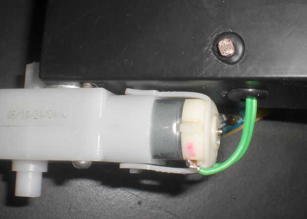 En esta posición "parece" fuera cuando las persianas están abiertas y directamente en las persianas cuando están cerradas. Encontré que este arreglo funciona mejor porque suficiente luz brilla a través de las persianas que el controlador abierto las persianas por la mañana y los bloques de caja del proyecto todas las luces en la sala de brillando en la LDR y manteniendo de cerrar las persianas por la noche.