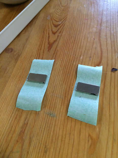 Luego coloque los imanes y alisar la cinta para que queden en el lugar correcto. Luego coloque a los espaciadores entre el imán y el metal. Dejar secar según las instrucciones del pegamento.