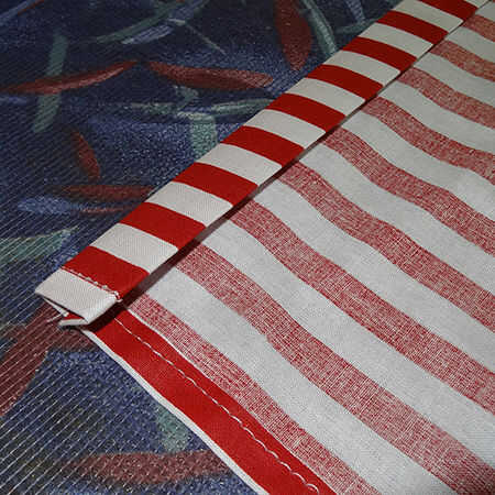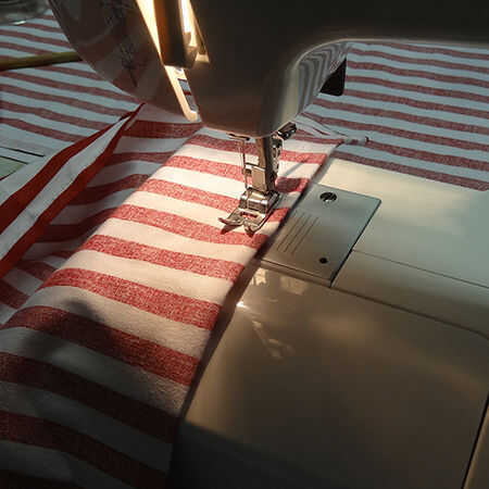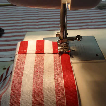 5. iniciar en la parte inferior y coser una puntada corriente arriba a los lados, dobla sobre y en la parte superior y hacia abajo al otro lado. Puede que necesite quitar el último pin de los bolsillos a coser alrededor de los lados.