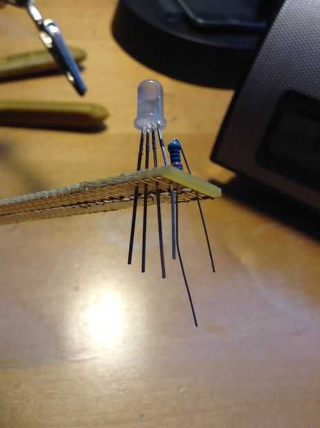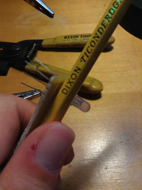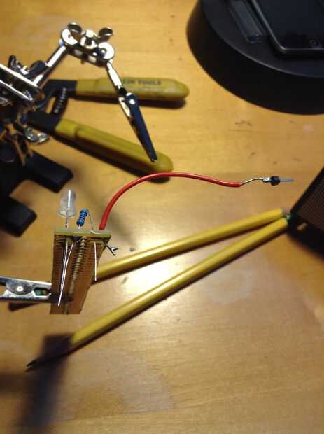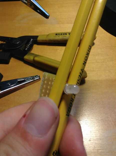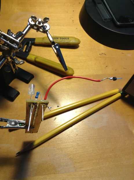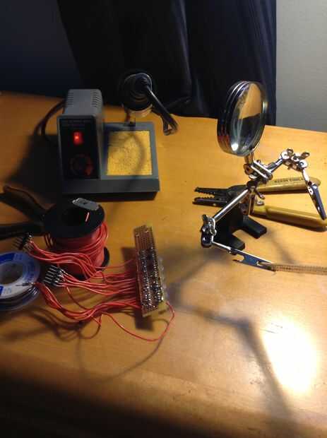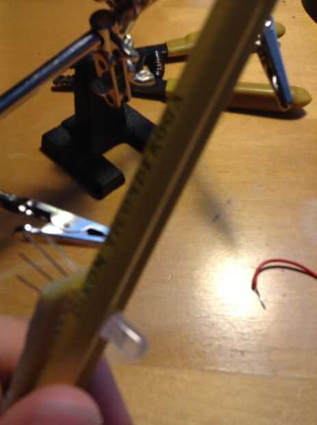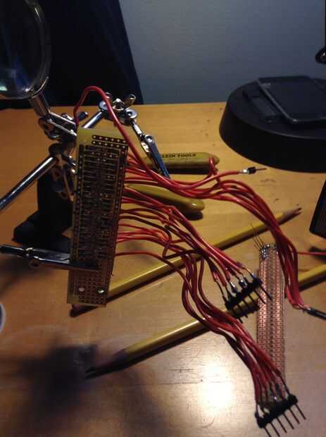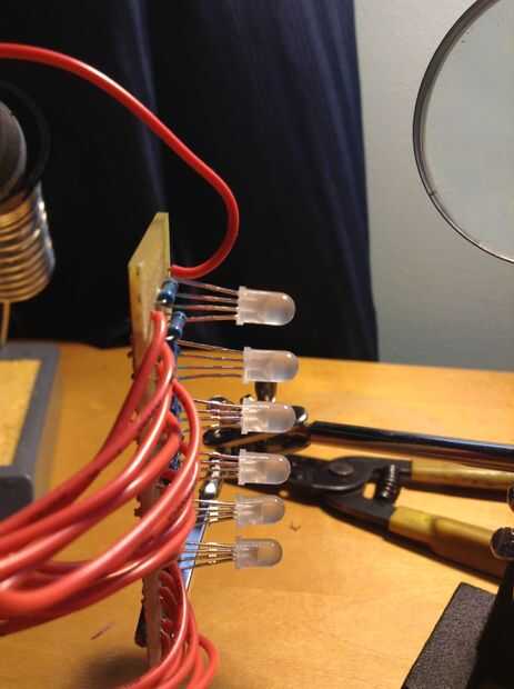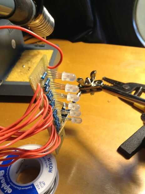 Now its time for some soldering! antes de comenzar Asegúrese de que su materia está listo para funcionar y el soldador esté caliente. En primer lugar, tomar sus LEDs y soldarlos en lo borde del lado largo asegurándose de que cada lado plano de los pilotos se enfrentan a la misma manera, esto es muy importante. Usé dos lápices para asegurarse de que todos los LEDs eran la misma distancia de la Junta de tira. Ahora soldar una resistencia sobre el puente para cada pin en el LED excepto el perno más largo. Ahora vas a conectar entre sí todos los ánodos (el pasador largo). Una vez el LED y los ánodos se sueldan y los ánodos conexión su tiempo para los cables de puente. cada cable de puente tendrá que ser de 6 pulgadas o más larga. Ahora soldar un perno jefe a uno de los cables y conectar a todos los ánodos, esto irá a 5v en el Arduino. ahora a partir de la parte superior de la Junta de tira de la soldadura de los cables a los otros extremos de las resistencias. Por último, cada seis alambres de la soldadura de una fila de 6 terminales de cabecera, usted debe terminar con 3 grupos de 6.