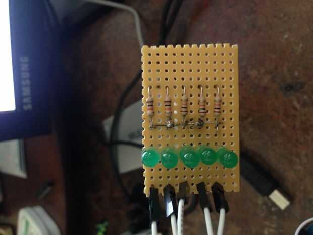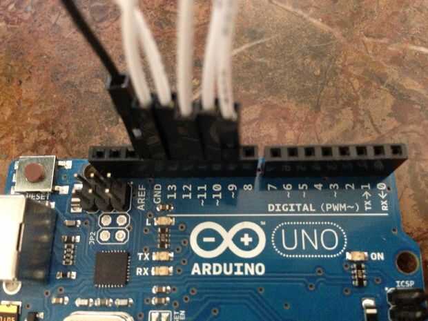 todos los pines de tierra de los LEDs del alambre juntos y poner un cable de puente desde allí a tierra en el Arduino. Cable de los ánodos de cada LED individual a 12,11, 10, 13 y 9. de arriba a abajo. Las resistencias fueron un error cuando diseñó. Lo sentimos, la imagen es hacia los lados.