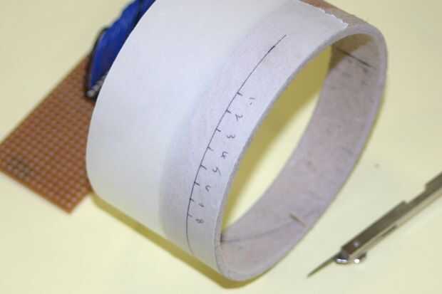 Identificar el común de la pierna de la pierna y luego doblar las otras 3 patas hacia adelante y hacia atrás, el mismo se dobla para el 8 de LED. Luego tome un poco de cinta adhesiva y trazar una línea de 10mm desde el borde y la marca de espacio de 6mm para el 8 LED (la imagen muestra esto mejor que lo puedo explicar). A continuación coloque la cinta en el tubo y perforar a través el cubo con un punto de la brújula.