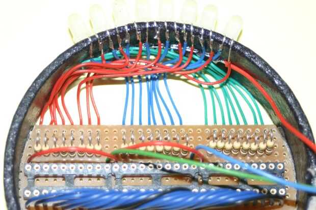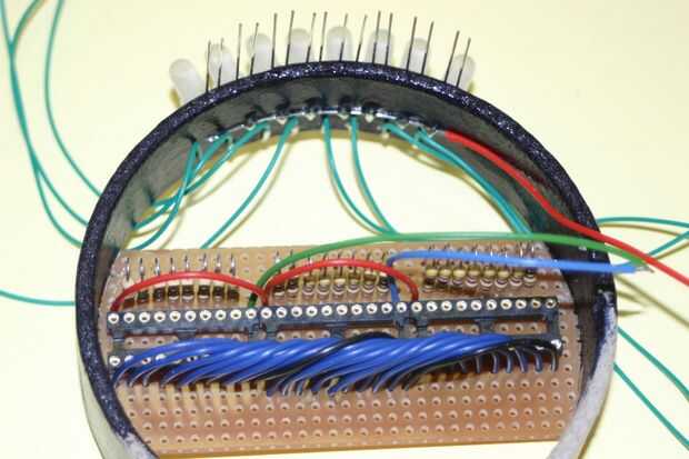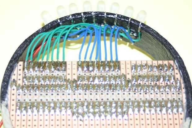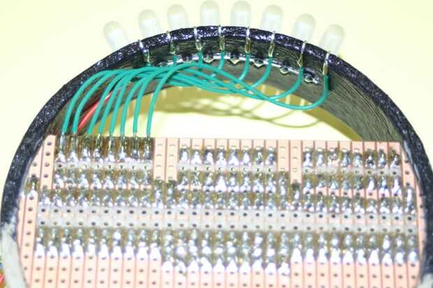 Una vez que estés feliz con la placa entonces presentar los extremos para satisfacer el tubo que tienes y el tablero del pegamento en la parte posterior del tubo como se muestra en uno de los cuadros. Entonces un color en un momento de la soldadura de los cables conectados a las patas del LED en el borde del tablero para que estén conectados a las resistencias de salida. Luego conecte los cables de Arduino y por último la potencia.