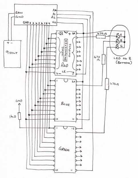 3 virutas se utilizan para conducir los 3 diferentes colores y se unen las patas de entrada 8 y el 3 LE (latch enable) ir a diferentes clavijas en el Arduino para seleccionar el color correcto para el patrón a las entradas (eso suena muy confuso pero no!).