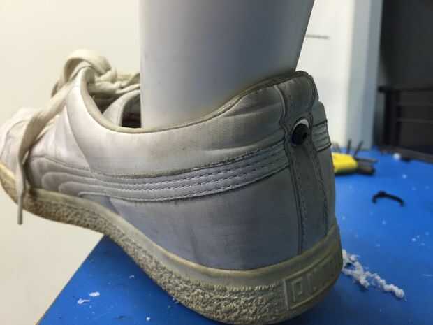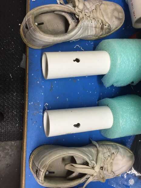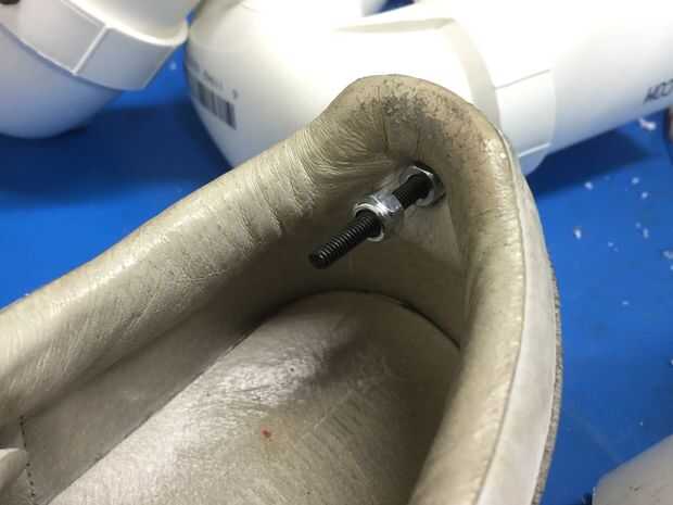 Os adjunto los zapatos hoy. Se puede ver como lo hice en el último par de fotos, pero voy a describir así. Taladró una ranura de bocallave de la parte inferior de las piernas y entonces había unido a un tornillo con una tuerca nylock al final en cada zapato. Esto hará fácil de colocar y quitar cuando llegue el momento de montar el traje y después desnudarse cuando he tenido demasiadas cervezas calabaza.