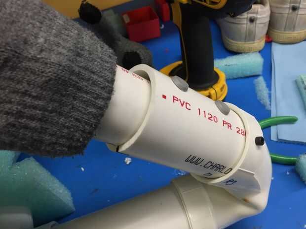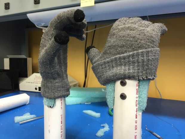 Por último, me cortar unas ranuras de 1-1/2" PVC y había ajustado a la longitud. Mi idea original era que fije estas manos directamente a las patas falsas de alguna manera y dejar que la "muñeca" PVC tubo a justo tipo de flotador en el tubo más grande, pero me di cuenta de que probablemente debo montarles aquí. Necesitaba las manos al ser removible para poner la ropa en los brazos sin necesidad de herramientas, así que ideé un plan para el tubo más pequeño que ser agarrado por estas cosas puntiagudas de goma poco dulce.