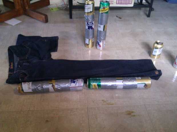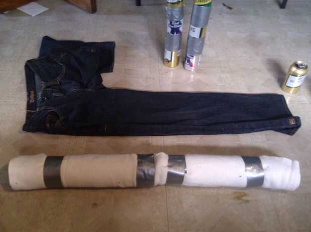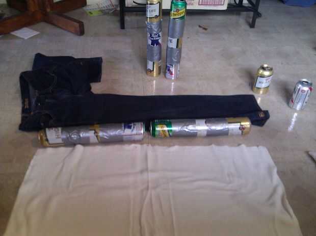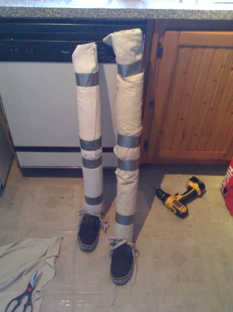 Este traje es barato y bueno para el medio ambiente. Para las piernas, el conducto grabado junto latas de cerveza vacías para la estructura y luego envuelto algunos manta alrededor de ésos con más cinta adhesiva.