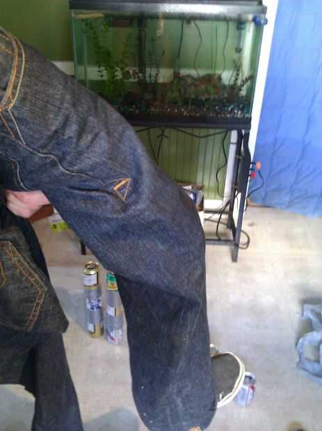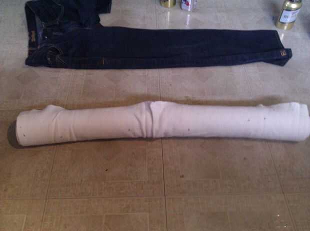Luego introduce las piernas de los pantalones y taladrar más agujeros en la parte superior de la tela de las piernas y la cintura de los pantalones vaqueros. Más cordón fue utilizado a través de los agujeros.