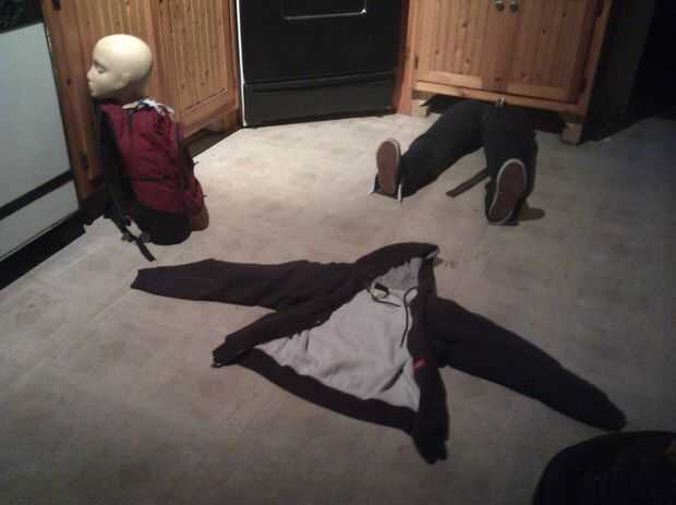 6: marrón con capucha en, cubrir la cabeza del maniquí con capucha, cremallera una o dos pulgadas delante de la cintura, los brazos alrededor de su torso y les apagado.