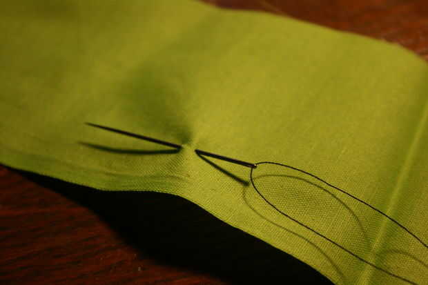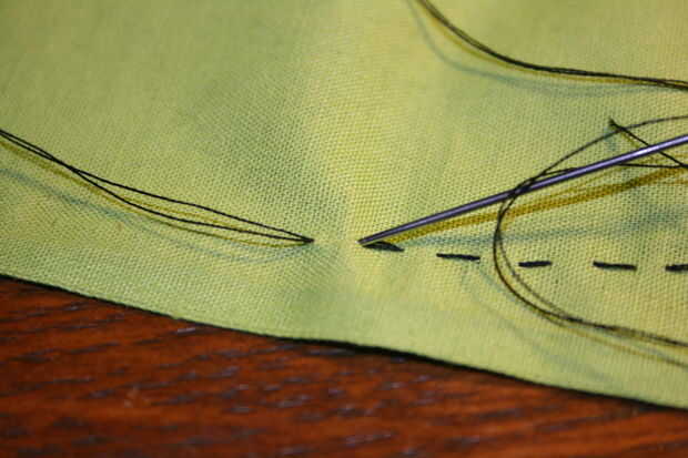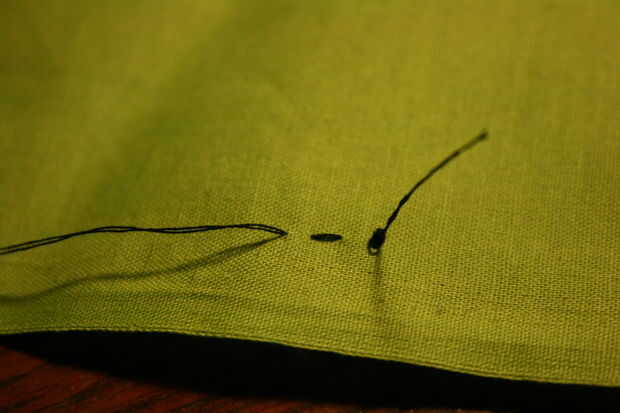 Si el tejido es lo suficientemente delgado como para manejar una puntada incluso puede que sea más fácil y rápido para penetrar la aguja a través de ambos puntos en la línea al mismo tiempo. Si está seguro de que podría incluso golpea varios puntos a lo largo de la línea a la vez.