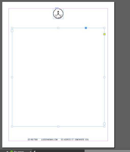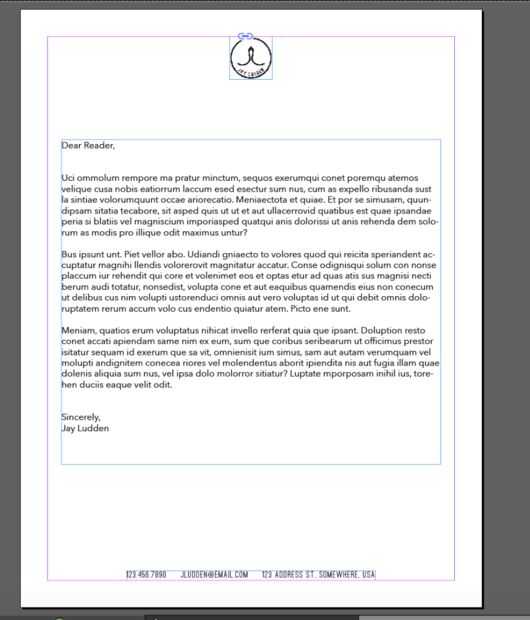 Abrir InDesign y colocar su logotipo. Añadir cualquier otro elemento que se desea, como un pie de página con número de teléfono y dirección de retorno. Hice un cuadro de texto y quería ver lo que puede parecer como en formato de letra, así que llené con lorem ipsum texto clic derecho sobre el cuadro de texto y haga clic en relleno con texto de marcador de posición. Me deshice de texto extra que no necesito.