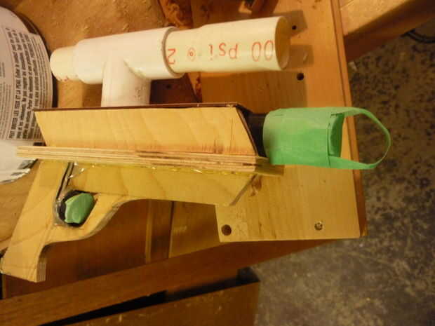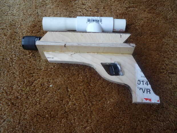 De todos modos, dado lo que había aprendido de lo que el personal, era una construcción fácil, y de 15:00, se realizó pintado a spray. No me inclino a escribir todo instructivo, pero he metido en el hábito de tomar fotos como ir y a este paso son un montón de fotos. Básicamente, la pistola fue hecha de desechos, el mismo tipo de linterna que los usos personal y algunos accesorios de PVC como un ámbito. El interruptor de botón ha sido repurposed como disparador. Mi hijo pareció impresionante, y a pesar del trabajo acometido, la pistola parecía grande un truco o tratar - y por supuesto sirve como una útil linterna.