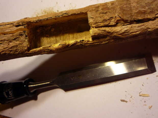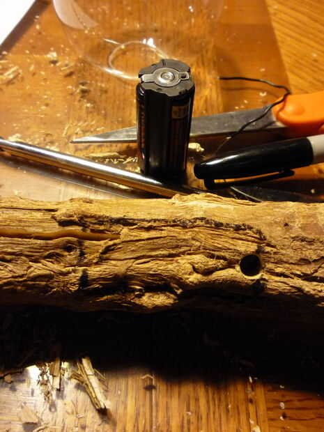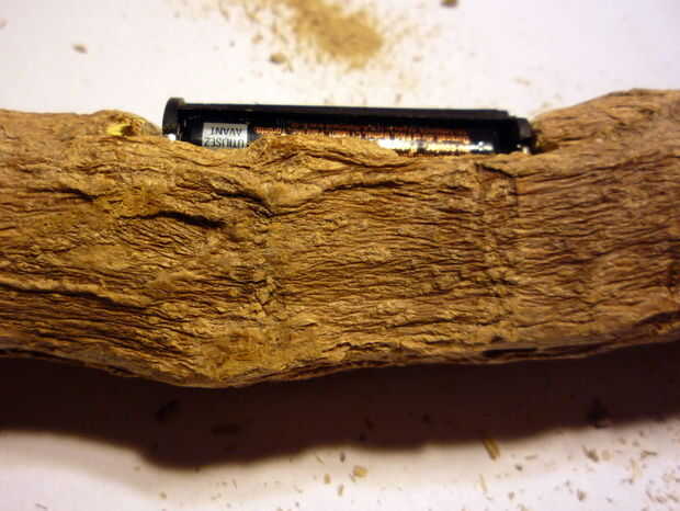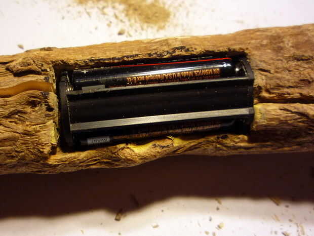 Crear una cavidad de la batería en el extremo del agujero que ha perforado hacia abajo por la parte superior. Desea un ajuste razonable.