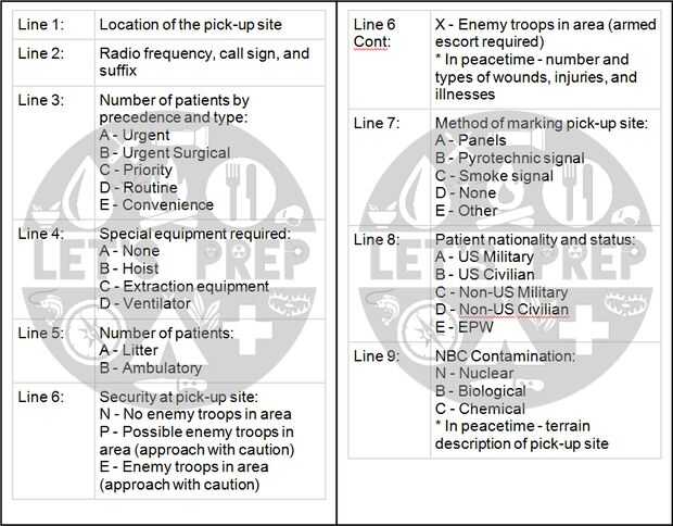 Otro elemento de que también llevaría un número sería una hoja laminada de contacto y tarjeta 9-Line solicitud de evacuación médica.