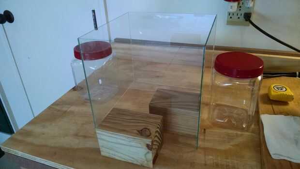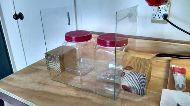 Una vez que los bordes de dos silicona seco, llevar los tres paneles verticales y añadir silicona a los dos bordes restantes. Agarra tu cuarto panel de vidrio y fíjelo para formar una caja. También puede utilizar un objeto como un pedazo de madera para mantener esta pieza de vidrio en posición vertical hasta que se seque la silicona.