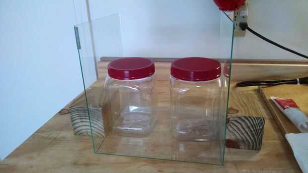 Tomar uno de sus paneles de vidrio y colóquelo sobre una superficie plana resistente. Añadir silicona a lo largo de un borde del panel de vidrio. Tomar un segundo cristal y colocar su borde en la silicona. Mantener en su lugar y usar un elemento como una pieza de madera para mantener vertical hasta que se seque la silicona. Para ello en el borde opuesto del primer cristal de vidrio con un tercer cristal. Ver la imagen de arriba.