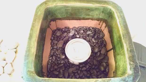 También he añadido rocas negras pequeñas en el interior de la jardinera para rodear la lata de café para agregar cierta estabilidad. Usted puede comprar bolsas pequeñas de rocas en una tienda de artesanía como Michaels o sólo puede escoger mexicano más pequeños guijarros de la playa en la desean. Utilicé una combinación de ambos.