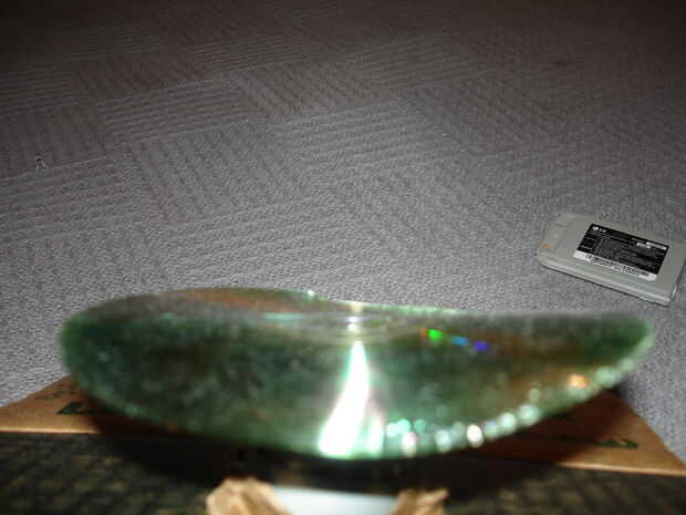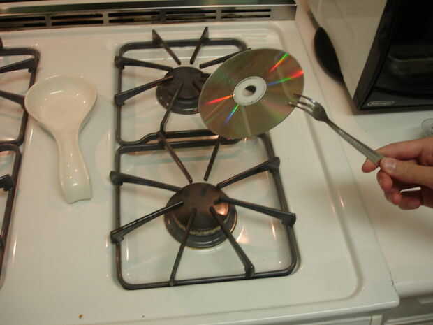 Tomar el cd y derretir sobre la estufa, muy cuidadoso! He encontrado que se puede mantener fácilmente el cd con un tenedor, el objetivo es hacer el cd tan ondulado como sea posible. No tienen el cd a cerca de la llama o se quemará y el lado reflexivo comenzará a burbuja y pelar.