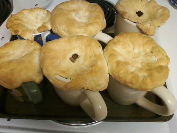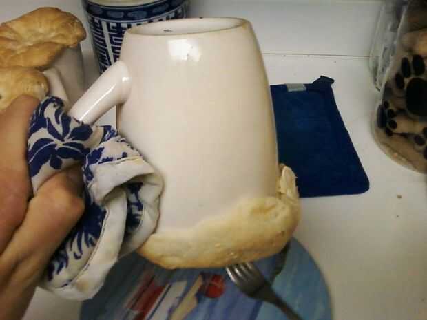 Una vez fuera del horno dejar enfriar unos minutos y luego con mucho cuidado una agarradera para volcar la taza invertida de su placa. Utilice la horquilla para raspar y empujar la corteza como esta. ¿Ves por qué era importante a greese la Copa? Ahora toma sólo un segundo para admirar su propio plato hondo personalizada pizza. Luego comer y disfrutar.