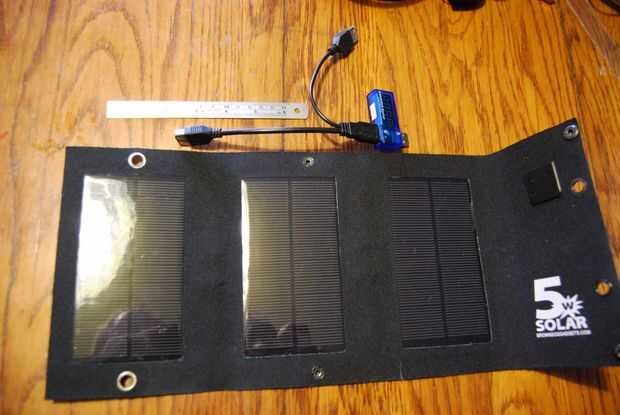 Gadgets de perro marrón hace una serie de portátiles de células solares paneles con construcción en regulación de voltaje para fuente de + 5V en un conector USB. Que he elegido puede suministrar 1A en plena luz del sol o 5W.