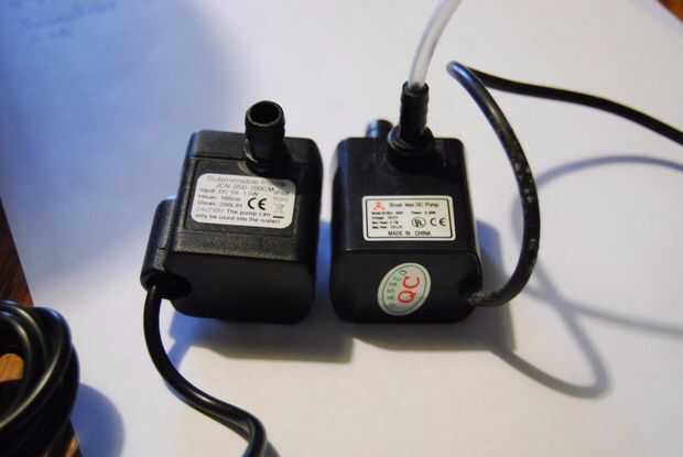 He comprado una pequeña, USB accionado la bomba sumergible, típicamente usada en fuentes. Las especificaciones son: 5V a 300ma (1.5W). El uno a la derecha era de una generación anterior y ajuste el tubo mejor.