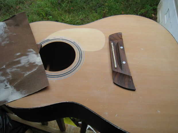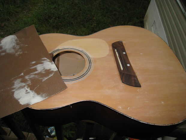 Se pintar la parte superior de esta guitarra solo, pero si lo desea puede pintar la cosa entera. Si usted tiene un viejo rasguñada para arriba escoge usted puede quitar la placa esto ahora. Algunas pick placas como el de esta guitarra barata se pegan con adhesivo de doble palo en y sólo puede ser halado con poco esfuerzo, algunos necesitan un gran esfuerzo, y otras tendrán los tornillos que se retire la placa de la selección de la guitarra. ¡ Ahora una nueva placa pick o guardar éste para reutilizar más adelante. Opté por dejar la unidad apagada totalmente. Ahora que se retira la placa de pick, "mano" arena de la parte superior de la guitarra asegurándose de arena junto con el grano no contra él. No tienes que lijar hasta la muerte, lo suficiente para quitar la capa superior de shiney haciendo un agradable acabado mate que la pintura de aerosol puede adherir a.