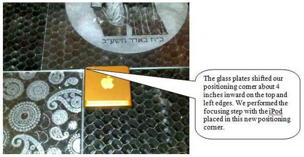 Si la mesa de la laser es plana, teóricamente es posible el enfoque paso con el iPod se coloca en cualquier lugar en la bandeja de láser. Preferimos enfocar con el iPod puesto en o muy cerca del lugar donde se sentará durante el grabado. La tabla de láser de Epilog es también grandes (24 por 18 pulgadas) en comparación con el tamaño del iPod Shuffle, así que quería el iPod de la esquina de arriba a la izquierda por defecto de la tabla para facilitar su manejo y ajuste de la carga. Encontramos dos piezas cuadradas de vidrio trabajado gran desplazamiento el posicionamiento esquina hacia el centro de la tabla del laser mientras que mantiene el iPod directamente alineado con la mesa. Si no tienes piezas de cristal cuadrado, cualquier objeto cuadrado plano funcionará igualmente bien; sólo asegúrese de que el material es láser seguro para la máquina para que no tengas un problema si el laser la viga sin darse cuenta golpea cualquier pieza.