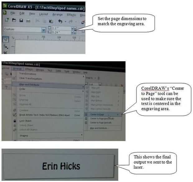 Hemos utilizado CorelDRAW para crear un objeto de texto en una página de tamaño para que coincida con las dimensiones de la superficie de grabado determinada en el paso 3.