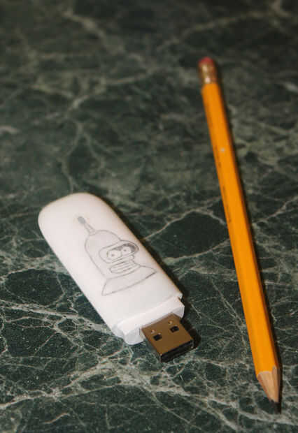 Disclaimer: no tengo ningún talento para el dibujo. Así busqué en Google para imagen de Bender, impreso con cierto zoom (tamaño modem), cortar imagen y delineadas con lápiz sobre la superficie de módem.