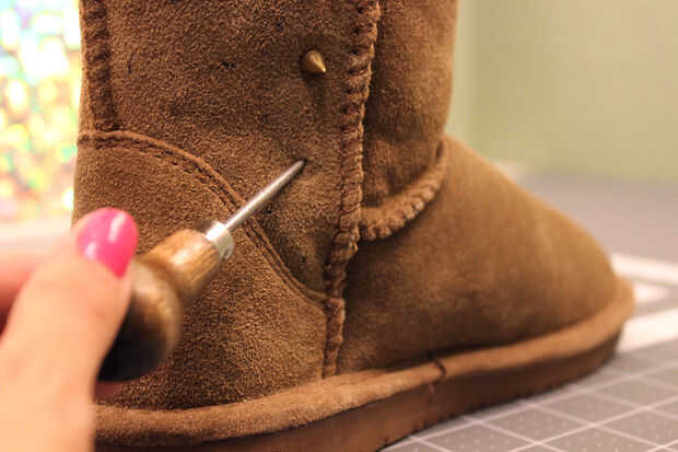 Una vez que las posiciones están marcadas, utilice un punzón o algo fuerte para meter agujeros a través de cada marca.