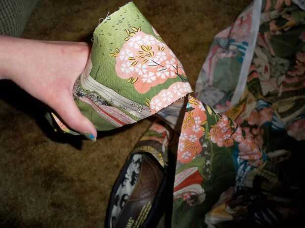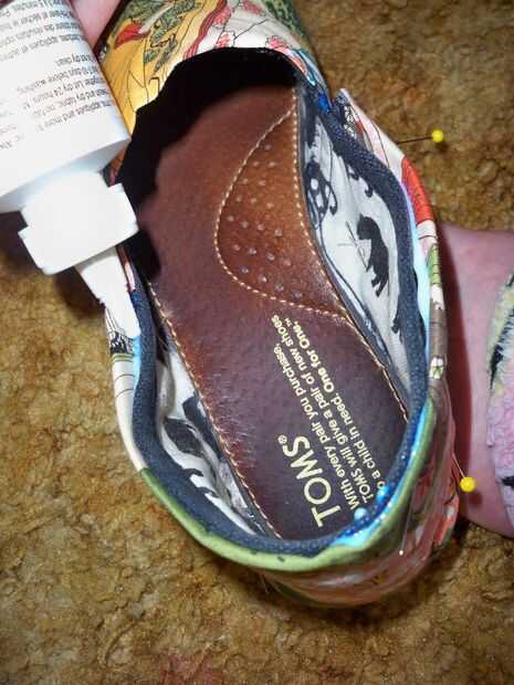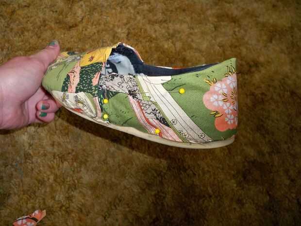 Utilizar el mismo método que antes para pegar sobre el material para la parte de atrás del zapato. -Cortar un trozo lo suficientemente grande como para caber alrededor de todo el camino -Doblar en bordes -Pin y encolar en su lugar