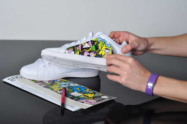 3. pele apagado la etiqueta engomada y coloque cuidadosamente sobre el zapato. Repita estos pasos para el otro zapato y voila! Los zapatos parecen completamente diferentes!