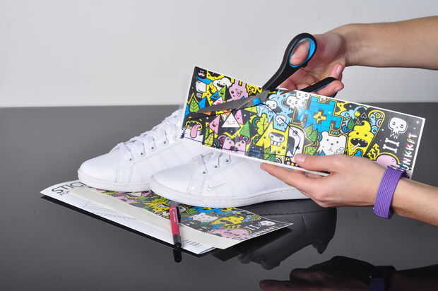 1. los Kits de etiqueta engomada del patrón completo de FunkKit con 2 tiras de diseño pegatinas y 2 tiras de papel adhesivo transparente. Coloque el papel en el zapato y luego usar un marcador para trazar el área del zapato que desea personalizar.