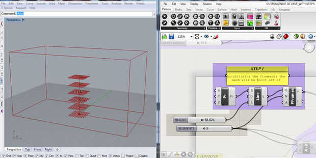 Si usted tiene Rhino pero no saltamontes, vaya descargarlo! Es totalmente gratuito. Yo también uso un componente al final de la definición que viene de Weaverbird, un plugin gratuito para saltamontes. (Si no lo tienes ya entonces te alegrará lo descargaste!) Cuando se abre la definición de low-poly Jarrón aparecerá un cuadro de forma y estructura metálica base en rhino-espacio. La forma es la malla de florero personalizables, y la caja es una herramienta de visualización que aproximar el volumen de cama de la impresora. Esto se puede ajustar dependiendo de lo que está utilizando la impresora y es actualmente definido el tamaño de un Makerbot Replicator 2 X.