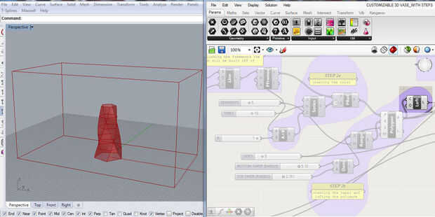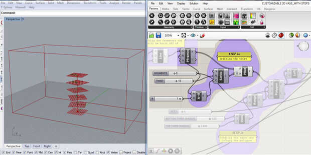 Una vez creados los frames, se pueden girar para dar el florero una ventaja dinámica. Un componente de la serie controla la cantidad de rotación (en grados) que cada fotograma se moverá en relación a la estructura por debajo de ella. Tenga en cuenta el componente de adición justo antes de los componentes de la serie. Al establecer una cantidad de segmento para la componente perpendicular de Marcos, su salida no cuenta el marco de fondo que caps off el primer segmento. Como resultado, después de aplica la rotación de los dos cuadros superiores permanecerá paralelos a uno otro. Mi cruda pero efectiva solución era simplemente utilizar el componente de adición para añadir un valor de uno (1) para el control de deslizante de segmentos y enchufe que resultan en el componente de la serie. Problema resuelto! (Los cuadros de impresión y archivo stl al principio no tienen este problema solucionado, pero si como la mirada entonces sólo el componente de adición de puente!)