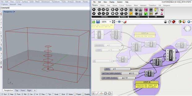 Ahora que los marcos tienen un toque agradable, se pueden modelar polígonos en ellos para crear el shell de la vasija. El componente de polígono permite establecer el número de lados tiene su vaso, así como el valor del radio, que es donde la forma cónica. Para crear la forma cónica, un flujo de trabajo de dominio/gama puede ser y a reguladores para sus valores superiores e inferiores, control de la cantidad de forma cónica en la parte superior e inferior de la vasija. Tenga en cuenta que estos valores Conecte el radio, así que por la mitad!