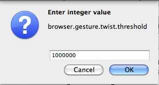 Si desea desactivar el giro, pero mantenga su preciosos los comandos set, se podría establecer el valor de giro a un cierto número masivo arbitrario, como 1000. Esto sería todo un reto para conseguir un toque reconocido en firefox. Literalmente sería necesario caminar alrededor de la computadora con los dedos sobre el trackpad torciendo todo el tiempo para varias revoluciones conseguir uno para registrarse. Un concurso donde la gente establece su valor browser.gesture.twist.threshold en números masivos y conseguir uno reconocido por Firefox sería divertido.