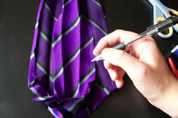 Luego necesitas dibujar la plantilla, (te recomiendo que para ello, porque para empezar a cortar de inmediato y terminó con no hay suficiente material, por suerte tuve unos lazos a juego con) dobla el extremo delgado de la corbata y coloca sobre el extremo ancho y dibujó alrededor de él porque era el tamaño perfecto.