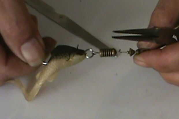 Con el gancho en el extremo del anillo de fijación deslizó el gancho en el anillo de fijación hasta que el gancho de nuevo se une a su señuelo. Con un anillo de fijación puede cambiar hacia adelante y hacia atrás entre un solo diente y un anzuelo triple.