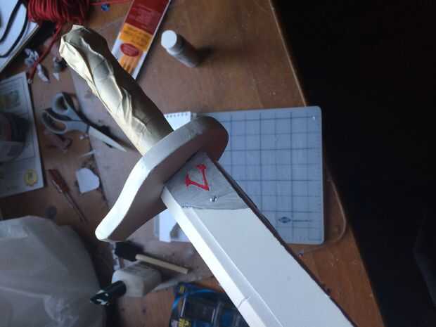 Hacer esta obra con mi traje que diseñará en el logo de Assassins Creed en la parte inferior de uno de los paneles. Encubrir errores fui entonces alrededor de ella con pintura de plata. En este punto dio todo una pareja capas de capa clara de Krylon brillo para proteger el trabajo de pintura. Después de esto me corta algunos tornillos y había pegado en los agujeros en los paneles. Estos por supuesto no sostienen en, están sólo para hacerlo un poco más realista. Después de que el pegamento seque me había quitado la cinta de la empuñadura y envuelto en rojo paracord.