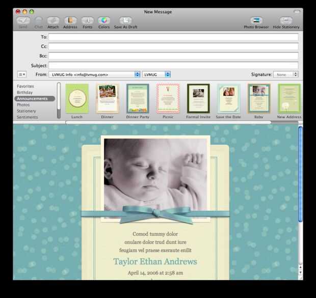 Cuando Apple introdujo por primera vez Leopard (Mac OS X vers. 10.5), una de las características realmente era la característica de papelería en la aplicación de correo. Había suministrado un número de plantillas profesionalmente diseñadas lo que es muy fácil de enviar mensajes de correo electrónico muy cool. Algunos de ellos incluso tenían la habilidad de cambiar el color de base. Esto era especialmente importante en la papelería "Anuncio del nacimiento".