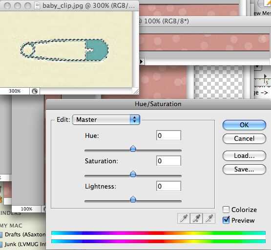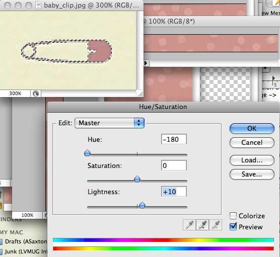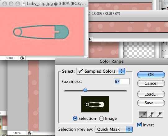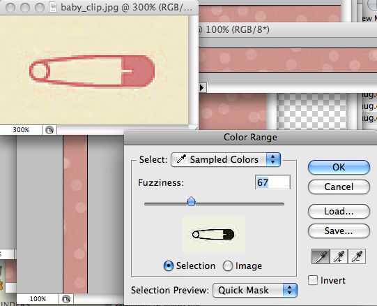 Puesto que la imagen es relativamente pequeña, nos vamos primero zoom la imagen 300%. Ahora usaremos el menú que seleccionar -> gama de colores... para seleccionar el fondo. ¿Por qué el fondo? Hay más de lo mismo, por lo que es mucho más fácil seleccionar. Sólo haga clic en el fondo y ajustar la tolerancia para que el clip de baby es el área sólo rosado. Ahora marque la casilla invertir para invertir la selección para obtener sólo el clip de baby... Haga clic en Aceptar y proceda a aplicar los mismos cambios de tono que el anterior.