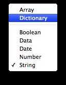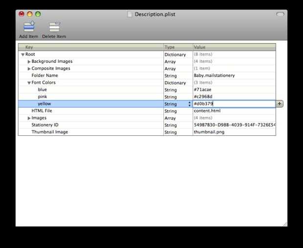 Ahora que nuestras imágenes se definen, definamos el color de nuestra fuente. Seleccione la línea de "Nombres de carpetas", haga clic en "Agregar elemento" nombre "Colores de la fuente" y asignar su tipo como diccionario. Abrir y añadir otro diccionario con el nombre de la clase que asigna a la definición de la fuente. Añadir los elementos de tres colores y darles los valores que anotó anteriormente.