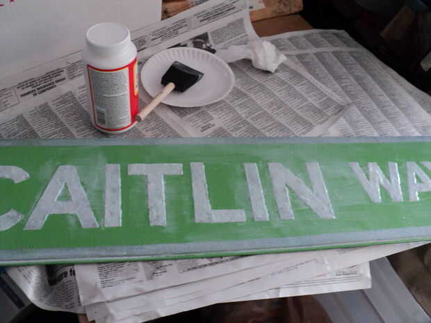 Utilicé un pincel de espuma para aplicar el Modpodge. Cuando empieza a secar y obtener pegajosa, puede rasgar pedazos pequeños del cepillo de la espuma que usted tiene que elegir antes de que seque completamente. Use un cepillo de cerdas regulares ya que las superficies de brillo actúan como papel de lija. Usted podría rociarlo con cualquier capa clara en su lugar. Un efecto no deseado de cepillado en la capa clara fue que parece que han distribuido el exceso brillo en las letras en el campo de la muestra. Cuando se ve directamente en con una luz brillante como cuando se acerca un coche, el signo entero actúa como una señal calle reflexiva.