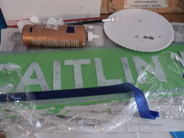 Cubrí con envoltura de plástico para poder presionar y aplanar las letras y para asegurarse de se adhirieron a la Junta. La envoltura plástica mantiene el exceso de pegamento de pegarse a los dedos y recoger el brillo que ya se ha secado en las letras.