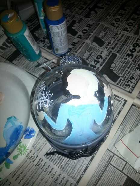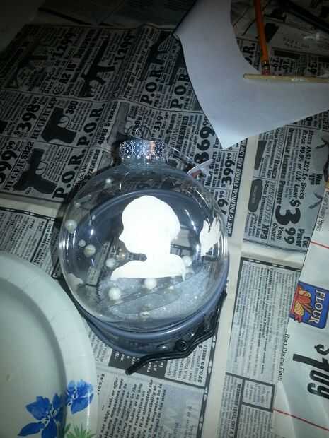 Sellan las partes barnizadas con sellador transparente. He utilizado mata que no estaba loco por al principio porque dio helada mirada. Siempre y cuando se concentran en las partes de pintura acrílica y no cubre el adorno entero con sellador, debe estar bien. Las piezas de pluma de pintura mantienen bastante bien. La idea es poder mirar a través del globo y ver las bolas de nieve suspendida.